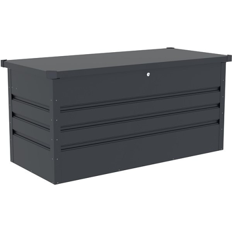 Kerti tárolódoboz - fém, fedélzáró pántok és lezárási lehetőség, űrtartalma 295 l, mérete 62 × 99 × 61 cm (Ma×Sz×Mé), szürke kivitel, tömege 17000 g A profi, 295 l űrtartalommal rendelkező ROJAPLAST kerti tároló láda lehetővé teszi a kerti szerszámok rendben tartását, hogy azok védve legyenek, és egyben kényelmesen tárolhatók kellően nagy helyen.