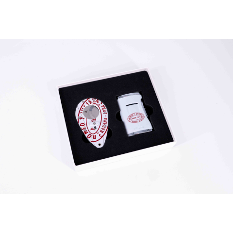 Romeo y Julieta márkájú szivaros szett, amely egy szúrólánggal égő szivaröngyújtót és egy dupla pengés pillangó szivarvágót tartalmaz. A szivarfogyasztók számára nélkülözhetetlen tartozékokból álló készlet a Romeo y Julieta márkára jellemző fehér és piros színekkel.A Habanos S.A. licencével a XIKAR által készített kiegészítők.A vágó: Alumínium házzal és kiváló minőségű nagy keménységű rozsdamentes acél pengékkel kés