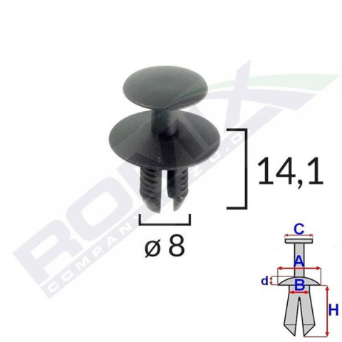 ROMIX | Patent Mercedes, BMW Méretek: A: 20,3 mm B: 8 mm C: 15,3 mm D: 2,4 mm H: 14,1 mm Lyuk átmérő: ø 8 mm