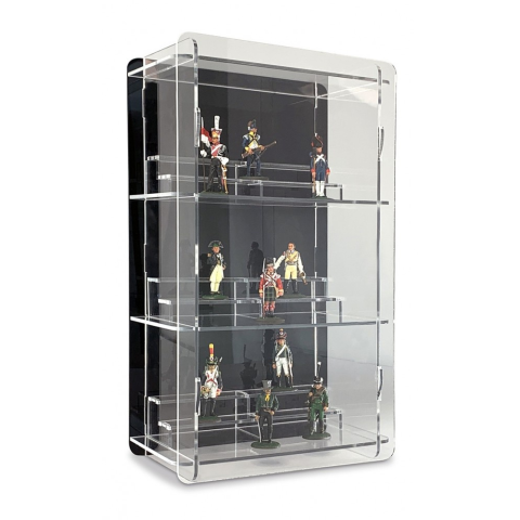 1 kép ROSA Figura, ólomkatona, bábutartó vitrin átlátszó akril fekete hátlappal állványokkal