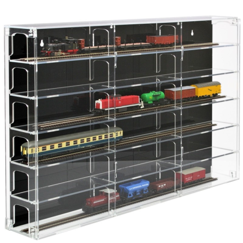 1 kép ROSA Modellvasút vitrin, polc bemutató szekrény átlátszó akril H0 méretarányú modellekhez fekete hátlappal