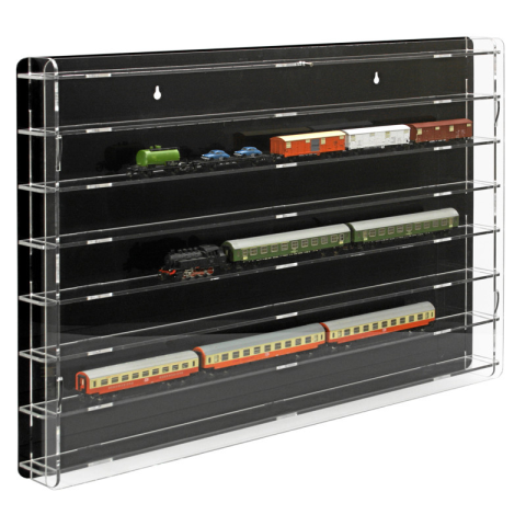 1 kép ROSA Modellvasút vitrin, polc bemutató szekrény átlátszó akril TT méretarányú modellekhez fekete hátlappal