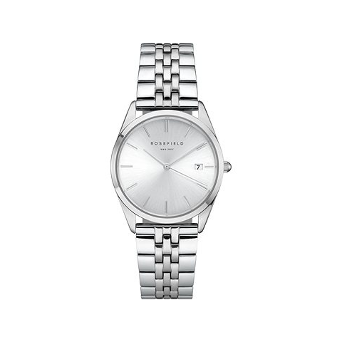 Karóra nőknek - analóg idő megjelenítés, óramű típusa quartz, kerek számlap, 12/24 órás formátum és dátum, elegáns, számozás nélküli, ásványi számlap, 30 m (3 ATM) vízhatlanság, a tok anyaga rozsdamentes acél, a tok színe ezüst, a szíj anyaga acél, a szíj színe ezüst, 12 - 19 cm csuklóméretre, cserélhető szíjjal A kiváló minőségű ROSEFIELD The Ace Silver Sunray Silver nőknek karóra remek választás a mindennapkora. A Quartz óraszerkezet rendkívüli