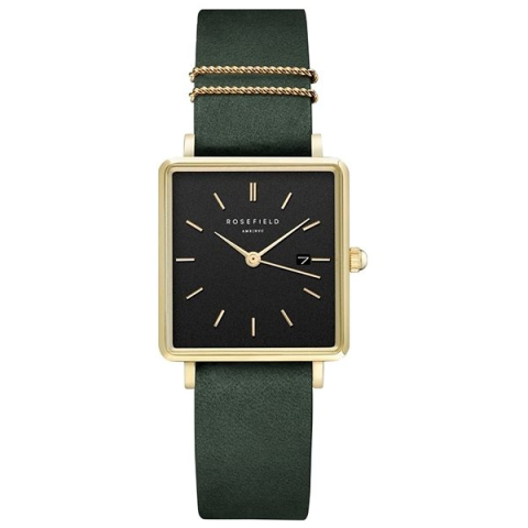 Karóra nőknek - analóg idő megjelenítés, óramű típusa quartz, szögletes számlap, dátum, elegáns, számozás nélküli, ásványi számlap, 30 m (3 ATM) vízhatlanság, a tok anyaga acél, a tok színe arany, a szíj anyaga bőr, a szíj színe zöld, 18,5 cm max. csuklóméretre A nagyszerű ROSEFIELD The Boxy QBFGG-Q031 nőknek karóra jól jön a mindennapok során. A hatékony Quartz technológia hosszú élettartamot és pontos mérést garantál. A klassz bőr szíj első pilla