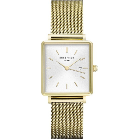 Karóra nőknek - analóg idő megjelenítés, óramű típusa quartz, szögletes számlap, dátum, elegáns, számozás nélküli, ásványi számlap, 30 m (3 ATM) vízhatlanság, a tok anyaga acél, a tok színe arany, a szíj anyaga acél, a szíj színe arany, 12,2 - 18,6 cm csuklóméretre A minőségi Rosefield The Boxy QWSG-Q03 nőknek karóra nagyszerű viselet hétköznap és ünnepnap is. A Quartz technológia hosszú élettartamot és precíz időmérést biztosít. A minőségi acél