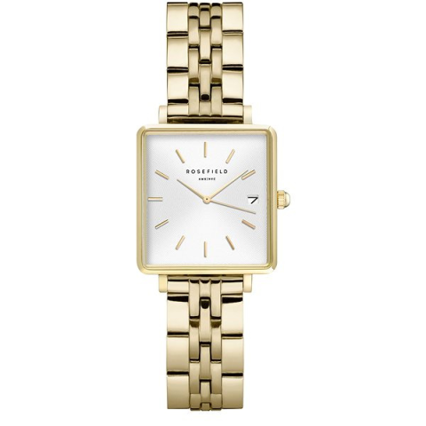Karóra nőknek - analóg idő megjelenítés, óramű típusa quartz, szögletes számlap, dátum, elegáns, számozás nélküli, ásványi számlap, 30 m (3 ATM) vízhatlanság, a tok anyaga acél, a tok színe arany, a szíj anyaga acél, a szíj színe arany, 20 cm max. csuklóméretre A minőségi ROSEFIELD The Boxy XS QMWSG-Q021 nőknek karóra remek választás a mindennapkora. A hatékony Quartz technológia hosszú élettartamot és precíz időmérést biztosít. A kitűnő acél szí