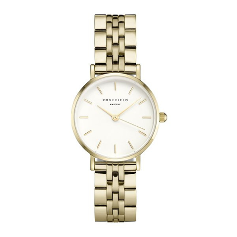 Karóra nőknek - analóg idő megjelenítés, óramű típusa quartz, kerek számlap, elegáns, számozás nélküli, ásványi számlap, 30 m (3 ATM) vízhatlanság, a tok anyaga acél, a tok színe arany, a szíj anyaga acél, a szíj színe arany, 20 cm max. csuklóméretre A kitűnő ROSEFIELD The Small Edit 26WSG-267 nőknek karóra nagyszerű viselet hétköznap és ünnepnap is. Az alapját egy 26 mm széles kerek számlap alkotja. A Quartz technológia precíz mérést és hosszú él