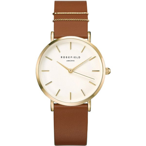 Karóra nőknek - analóg idő megjelenítés, óramű típusa quartz, kerek számlap, elegáns, számozás nélküli, ásványi számlap, 30 m (3 ATM) vízhatlanság, a tok anyaga acél, a tok színe arany, a szíj anyaga bőr, a szíj színe barna, 21 cm max. csuklóméretre A kitűnő ROSEFIELD The West Village WWCG-W86 nőknek karóra alkalmas mindennapi viseletre. Az alapját egy 33 mm átmérőjű kerek számlap alkotja. A Quartz technológia precíz mérést és hosszú élettartamot