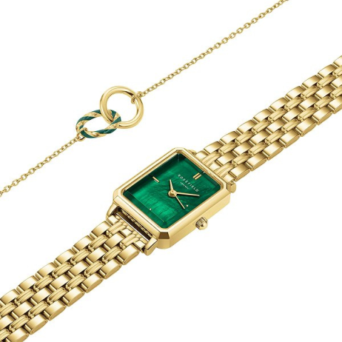 Óra ajándékcsomag - női, analóg idő megjelenítés, szögletes számlap, elegáns, római indexek, ásványi számlap, 30 m (3 ATM) vízhatlanság, tok anyaga rozsdamentes acél, tok színe arany, szíj anyaga rozsdamentes acél, szíj színe arany, karkötő szintén a csomagban A kitűnő Rosefield XS smaragd óra és smaragd karkötő OEGED-X288 egy olyan óra, ami eredeti kiegészítőként is szolgál. Elsőre a tok arany színe fog ámulatba ejteni azzal együtt, hogy a szíj anyaga