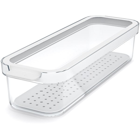 Hűtő rendszerező -, mosogatógépben mosható és egymásra rakható, űrtartalma 1,15 l, mérete 6,2 × 9,2 × 28,2 cm (Ma×Sz×Mé), világos kivitel Hűtő rendszerező CAUMA box 1,15l. Tartsd rendben hűtőszekrényed a CAUMA termékcsaláddal! Hét különböző méret kombinálható egymással, így kompakt és ideális rendszer hozható létre. A perforált betét le