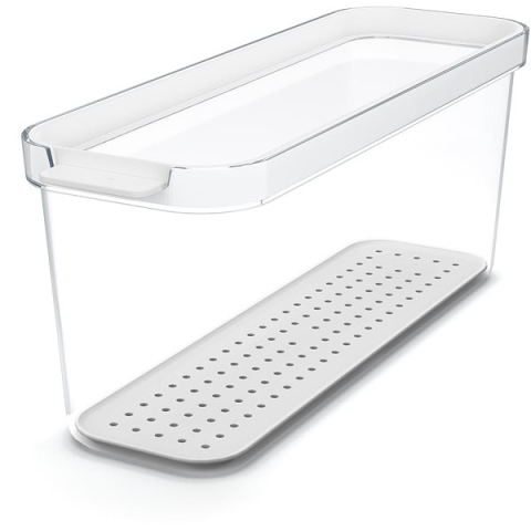 Hűtő rendszerező -, mosogatógépben mosható és egymásra rakható, űrtartalma 2 l, mérete 11,3 × 9,2 × 28,2 cm (Ma×Sz×Mé), világos kivitel A Rotho CAUMA hűtőszekrény-rendszerező segít rendben tartani a hűtőt és a lehető legjobban kihasználni a rendelkezésre álló helyet. Átlátszó műanyagból készült, így a doboz kinyitása nélkül is könnye
