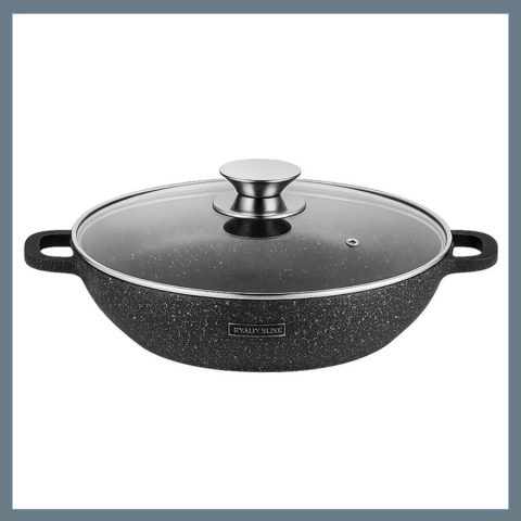 Royalty Line 40 cm márvány bevonatú sekély edény – 11,3 liter RL-BR40MGA Royalty Line RL-BR40MG egy prémium minőségű, 40 cm átmérőjű sekély edény, amely ideális nagyobb mennyiségű étel készítéséhez. A strapabíró öntött alumíniumból készült test kiváló hővezetést biztosít, míg a belső márvány bevonat megakadályozza az étel letapadását, és megkönnyíti a tisztítást.Főbb jellemzők:Anyag: Öntött alumínium (die-cast aluminium)Külső bevonat: Hő