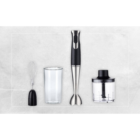 Royalty Line botmixer szett ESMS-800.743.2Az alacsony zajszintű motor teljesítménye 800W. Éles acél kések. Az aprító tál térfogata 500 ml. A tartó és az üveg anyaga sűrű műanyag. Teljesítményszabályozás , be- és kikapcsoló gomb és turbó üzemmód. A test rozsdamentes acélból készült, kiváló minőségű műanyaggal kombinálva. A turmixgép készlete egy habverőből tejszínhabhoz, tojáshoz, krémek készítéséhez és egy aprítóból áll, amelyre a turmixgép k