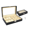 Ebben az esztétikus tárolódobozban 3 rekesz van a szemüvegeknek és 6 rekesz az óráknak, amelyekben más ékszereket is elhelyezhet. Az elegáns fekete színű láda fehér varrással készült, ami eleganciát és stílust kölcsönöz a tárolónak. Fedele átlátszó, aminek köszönhetően a doboz nem csak az órák és szemüvegek tárolásra és rendben tartásra használható, hane