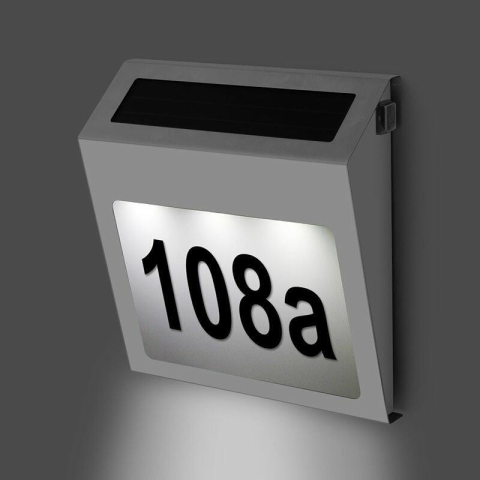 Egyedi, személyre szabható napelemes LED háttérvilágítású házszámtábla. A fényről két nagy teljesítményű LED gondoskodik, az eszköz tetején található napelem pedig felel a beépített akkumulátor töltéséért. Önműködő, alkonykapcsolóval felszerelt, így nappal töltődik, sötétedéskor pedig automatikusan világítani kezd. A felszereléshez szükséges csavarokkal és tiplikkel