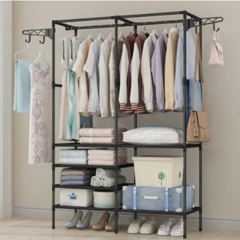 RPP Ruhaakasztó, ruhaállvány, gardrób polc, dupla, polcokkal, akasztókkal, fekete színben bútor termékleírás