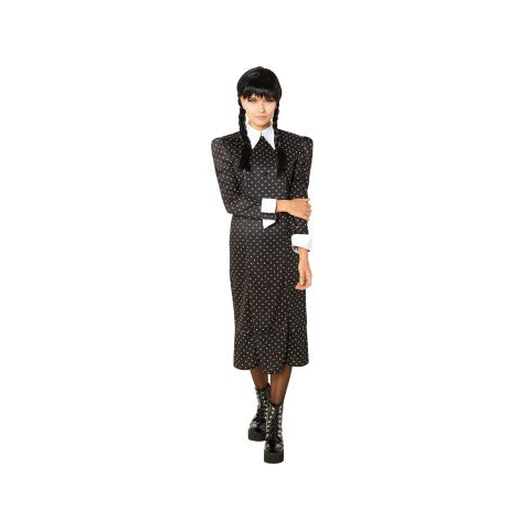 Wednesday jelmez beöltözős bulikra! A Rubies Wednesday jelmezével nemcsak a gyerekek, hanem a felnőttek is magukra ölthetik az Addams Family mosolytalan és igazán sötét dolgokon agyaló tagjának, Wednesday Addams-nek az ikonikus ruháját. A népszerű, Netflixen futó filmsorozatban látott ruha gombokkal mandzsettával és gallérral díszített, viselése tekintélyes, elegáns, ugyanakkor borzasztóan rejtélyes megjelenést kölcsönöz a viselőjének. A jelmez jó választás f