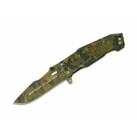 A RUI Mohican III hajtogatható zsebkés Camo zöld színű álcázási színű, 7Cr17MoV sima élű pengével, Flipperrel nyílik meg és egy Linerlock biztosítja. A fogantyú fluoreszkáló pontokkal rendelkezik, alján lyuk a húr számára. Nylon tokban van.