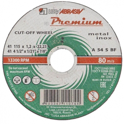 Prémium vágókorong fém, rozsdamentes acél 115x1,0x22,2mm LUGA//Russia átmérő: 115 mm vastagság: 1 mm befogás: 22.23 mmfelhasználás: sarokcsiszoló, fémhez EAN kód: 4603347110737