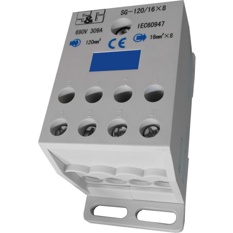 Fővezetéki leágazó sorkapocs. Fővezeték: 120mm2. Leágazó vezeték: 8x16mm2S&G SG-120-16x8 általános leírása:A sorkapcsok és vezeték összekötők az elektromos rendszerekben nélkülözhetetlen elemek, amelyek a különböző elektromos alkatrészek és vezetékek bizt