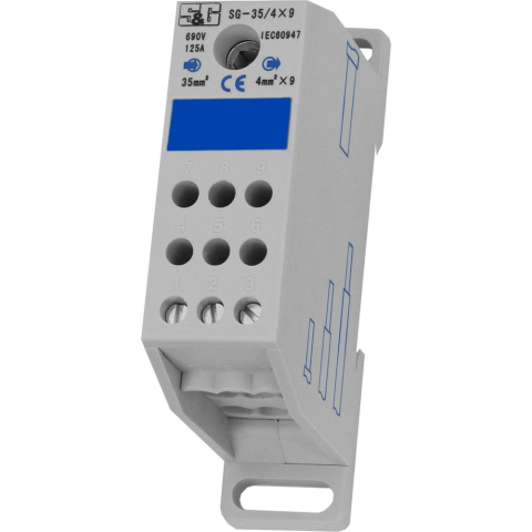 Fővezetéki leágazó sorkapcsok 35mm2 fővezetéki csatlakozással, 9x4mm2 leágazó vezetékS&G SG-35-4x9 általános leírása:A sorkapcsok és vezeték összekötők az elektromos rendszerekben nélkülözhetetlen elemek, amelyek a különböző elektromos alkatrészek és veze