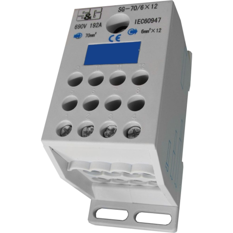 Fővezetéki leágazó sorkapocs. Fővezeték: 70mm2. Leágazó vezeték: 12x6mm2S&G SG-70-6x12 általános leírása:A sorkapcsok és vezeték összekötők az elektromos rendszerekben nélkülözhetetlen elemek, amelyek a különböző elektromos alkatrészek és vezetékek bizton