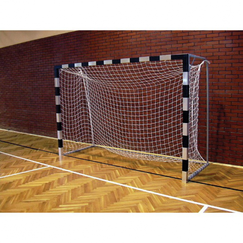 Hordozható, beltéri alumínium kapu, 80×80 mm-s, sarkainál lekerekített, belső rácsszerkezet erősítésű alumínium kapufákkal, porszórt hálótartó vasalattal. IHF előírás szerinti szabvány verseny kapu, MKSZ által elfogadott kivitel. A képen látható kapuháló külön vásárolható meg, az nem a termék része!