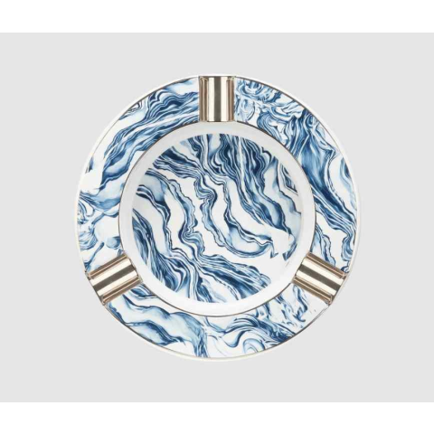 A különleges, kék márványhatású mintázat a víz természetes mozgását idézi, elegáns aranyszegéllyel és a márkára jellemző, precíz kidolgozással. A nagy méretű kialakítás kényelmes használatot biztosít, így egyszerre több szivar is elhelyezhető rajta. A három szivartartó vájat stabilan megtartja a szivarokat, miközben az ível