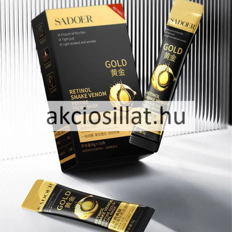 Sadoer Gold Retinol Snake Venom Peptide Arcmaszk 10x6g A Sadoer Gold Retinol Snake Venom Peptide Facial Mask egy prémium, fiatalító hatású arcmaszk, amely a bőrápolás új szintjét képviseli. A maszk a legmodernebb összetevőket tartalmazza, mint a retin