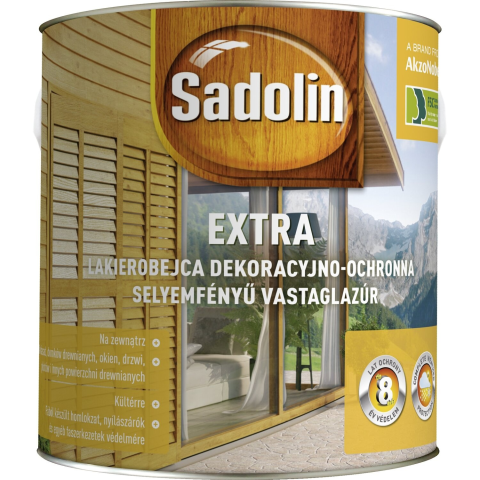 A Sadolin Extra kültéri, selyemfényű vastaglazúr óvja és díszíti a kültéri fafelületeket. Hosszantartó védelmet biztosít az időjárással, valamint a nap UV-sugárzásával szemben. Puhafa és keményfa felületek bevonására, natúr vagy már létező sértetlen, áttetsző bevonat festésére ajánlott. Vízlepergető hatású, és kiemeli a fa természetes szépségét. A megújult Sadolin Extra új összetétele révén még jobban beszívódik a fába, ezáltal még tartós