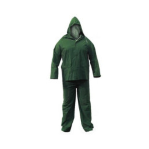 Kétrészes, PVC anyagból készült esőöltözet: kapucnis kabát zipzáras-patentos záródással, szellőzőkkel és két zsebbel, valamint gumis derekú nadrág. Fedett varrásokkal a vízzárásért. Színek: zöld és sötétkék. Méretek: M–XXL. Kiszerelés: 1 szett/csomag, 10