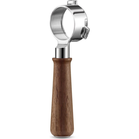 Kávéfőző tartozék - fenék nélküli kar, anyaga rozsdamentes acél és diófa, 54 mm átmérőjű portafilterekhez, méretei 57 × 75 × 223 mm, az extrahált kávé levegőztetéséhez és a crema javításához