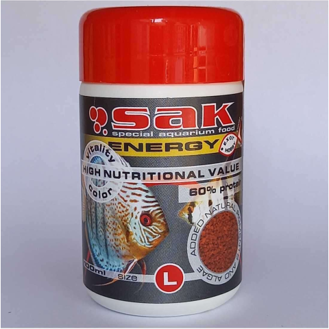 Sak Energy szemcsés díszhaleleség. Teljes értékű, magas arányú állati összetevőket tartalmazó granulált díszhaltáp. Ideális harcsafélék, vitorlások, diszkoszhalak, és húsevő sügérfélék etetéséhez. A magas vitamin tartalom és kiegyensúlyozott mennyiségű ásványi anyagok által a halak gyorsan és egészségesen növekednek, megőrzik színgazdagságukat, és ellenállóbbak lesznek.