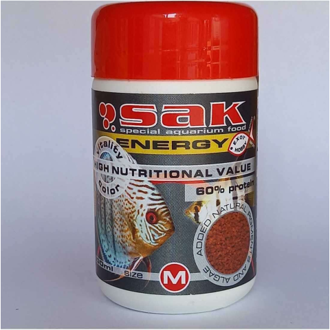 Sak Energy szemcsés díszhaleleség. Teljes értékű, magas arányú állati összetevőket tartalmazó granulált díszhaltáp. Ideális harcsafélék, vitorlások, diszkoszhalak, és húsevő sügérfélék etetéséhez. A magas vitamin tartalom és kiegyensúlyozott mennyiségű ásványi anyagok által a halak gyorsan és egészségesen növekednek, megőrzik színgazdagságukat, és ellenállóbbak lesznek.