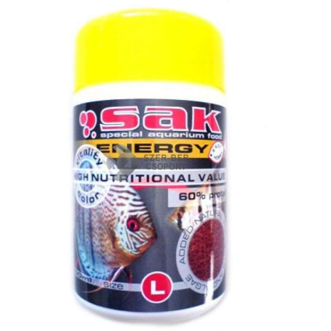 Sak Energy szemcsés díszhaleleség. Teljes értékű, magas arányú állati összetevőket tartalmazó granulált díszhaltáp. Ideális harcsafélék, vitorlások, diszkoszhalak, és húsevő sügérfélék etetéséhez. A magas vitamin tartalom és kiegyensúlyozott mennyiségű ásványi anyagok által a halak gyorsan és egészségesen növekednek, megőrzik színgazdagságukat, és ellenállóbbak lesznek.