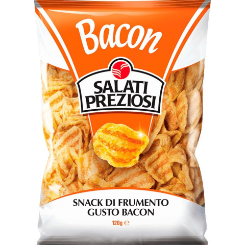 Salatipreziozi bacon ízű chips 120 g Salati Preziosi Bacon Chips 120 g Összetevök: Búzaliszt 80%, napraforgóolaj, só, dextróz, emulgeálószer: szódabikarbóna, ízfokozó: E621, kukoricakeményítő, cukor, aromák, füst ízek, színezékek: E120, E160b. Nyomokb