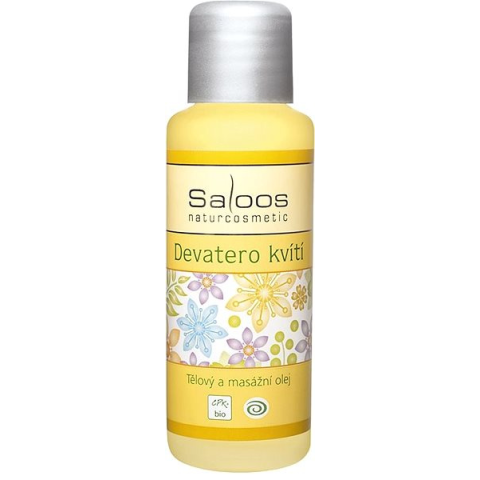 Masszázsolaj - 50 ml, zsíros, normál, kombinált, száraz és érett bőrre alkalmas, viszkető bőrre és száraz bőrre ajánlott, természetes olaj tartalmú, hatóanyaga: illóolajok, makadámia olaj, mandulaolaj, barackolaj, szezámolaj és napraforgóolaj, BIO A SALOOS Kilencféle virág bio test- és masszázsolaj hidegen sajtolt olajok és természetes esszenciális olajok egyedülálló keveréke, amely enyhülést nyújt a megfáradt hátnak, merev izmoknak és ízületek