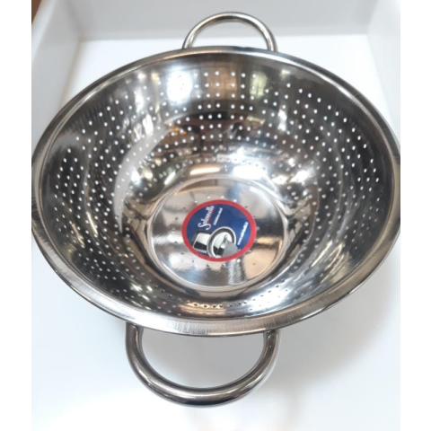 Rozsdamentes acélból készült talpas tésztaszűrő két füllel, átmérője: 24 cm. Olasz termék.