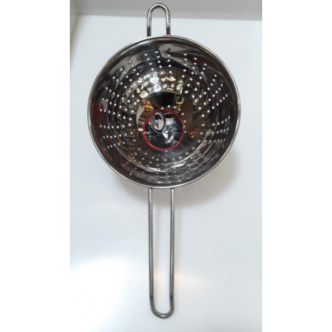 Rozsdamentes acélból készült nyeles tésztaszűrő, átmérője: 20 cm. Olasz termék.