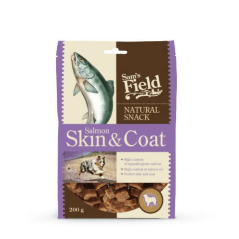 A Sam's Field Natural Snack Salmon Skin & Coat egy kiegészítő táplálék minden fajtájú kutya számára.