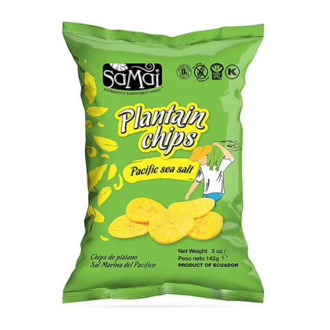 Ropogós plantain (főzőbanán) chips, mely kis adagokban, tengeri sóval ízesítve készül. 100%-ig természtesGluténmentesLaktózmentesHozzáadott cukor nélkülTranszzsírmentesKoleszterinmentesOlajos magoktól mentesKukorica mentesGMO-metesMSG (nátrium-glutamá