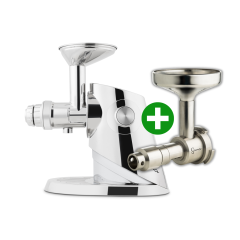 Mióta bemutattuk első facsarónkat, az emberek rozsdamentes acél facsarót kérnek. Négy év fejlesztésbe és tesztelésbe telt, mert jól akartuk csinálni. A világ legtartósabb facsaróját szerettük volna elkészíteni, ezért az olcsóbb rozsdamentes bevonatú alkatrészek helyett tömör rozsdamentes acél alkatrészeket használtunk. Elvettük a világ legjobb gyümölcscentrifuga motorját a Sana 727-ünkből, és acél alkatrészekkel bővítettük. Sokféle szűrőt teszteltünk