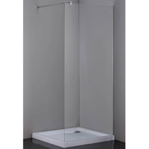 Walk-In zuhanyfal, 90*190cm, 6mm-es víztiszta biztonsági üveg, polírozott dupla alumínium fali profil, 68-103cm között állítható teleszkópos rudazat, mindkét végén csuklós rögzítési ponttal. Zuhanyfal beépítési méret: 88 x 188 cm.