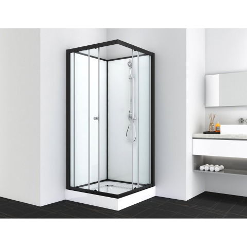 A teljes, szögletes zuhanykabin fekete profilokkal és 4 mm-es biztonsági üveggel tökéletes választás egy modern fürdőszobába. A kabin karcsú formákkal és alumíniumprofilokkal rendelkezik. A zuhanyzóban keverő csaptelep, zuhanyrúd és egy üvegpolc is található a zuhanytartozékok számára.