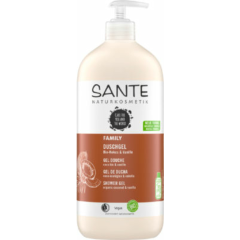 Sante Family tusfürdő bio kókusszal és vaníliával, 950 ml- Finom érett trópusi illattal- Bio kókuszdióval és bio aloe verával- Válogatott növényi alapú összetevőivel kíméletesen, mégis alaposan tisztít- Értékes bőrtápláló összetételével alapos hidratációt biztosít és csodálatosan puha bőrt eredményez - BDIH és Natrue által minősített natúrkozmetikumKiszerelés: 950 ml