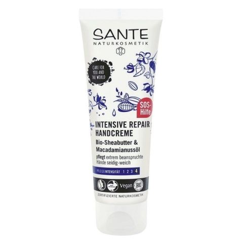 Sante intenzív kézápoló krém, 75 ml - Hat értékes olajjal és vitaminokkal ápolja és selymessé teszi az erősen igénybe vett kezeket - Javítja a bőr védekezőképességét - 100%-os hatékonyság - Bőrbarát formula -természetes illat - bio összetevők - Nem tartalmaz parabéneket, kőolajszármazékokat, mesterséges szín-, illatanyagot és-tartósítószert - Natrue által minősített natúrkozmetikum - Vegán Kiszerelés: 75 ml