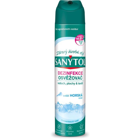 SANYTOL Hegyi levegő fertőtlenítő légfrissítő spray biztosítja a tökéletes higiéniát, miközben kellemes illatot varázsol. Egyedülálló összetételének köszönhetően semlegesíti a szagokat és elpusztítja a felületeken és textíliákon megtelepedett kórokozók 99,9%-át. 4 az 1-ben formulája: fertőtlenít és tisztít, szagsemlegesítő, nem károsítja a f