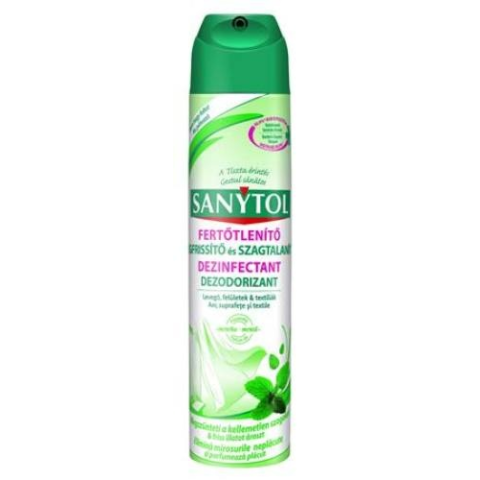 Légfrissítő, fertőtlenítő, 300 ml, SANYTOL, menta (KHT617) A Sanytol fertőtlenítő légfrissítő aerosol egyedülálló összetételének köszönhetően semlegesíti a kellemetlen szagokat és elpusztítja a felületeken és textíliákon megtelepedett kórokozók 99, 9%-