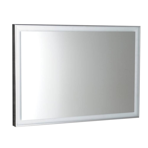 Fürdőszobai tükör polírozott alumínium kerettel, beépített LED világítással kapcsoló nélkül.