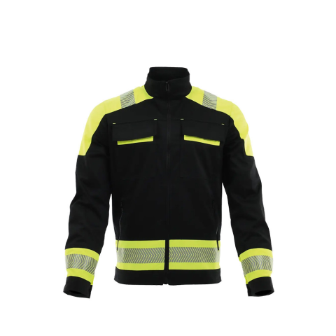 Karcsúsított szabás, rugalmas, funkcionális kialakítás. A vállakon, a mandzsettákon és a derék részen jólláthatósági modullal, és 5 cm széles szegmentált fényvisszaverő szalagokkal.álló gallércipzáras záródáskét cipzáras oldalzsebzsebfedős, tépőzáras mell